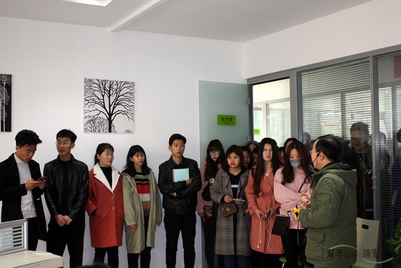 首先杜總監(jiān)帶領(lǐng)師生一行在一樓大廳學習雙豐企業(yè)文化:“天道、孝道、師道;團隊建設及榮譽殿堂、早會機制”等文化;然后又領(lǐng)師生們參觀了各個辦公室,并對各個辦公室工作分工進行了講解;接著帶領(lǐng)師生參觀了一二樓車間,在參觀過程中杜總監(jiān)跟王老師及學生們,逐項講解設備、產(chǎn)品和性能、工藝,結(jié)合實物產(chǎn)品和案例,給學生們講解如何從平面設計到最終的成品技術(shù)要素,平面設計發(fā)揮的作用和生產(chǎn)印刷成品的轉(zhuǎn)換過程、關(guān)鍵知識點等,同學們專心傾聽并認真觀察及記錄。