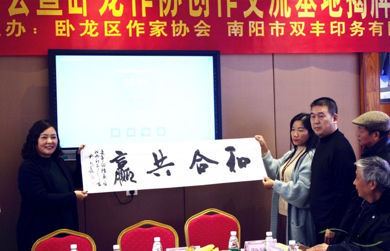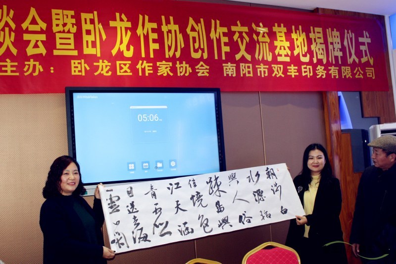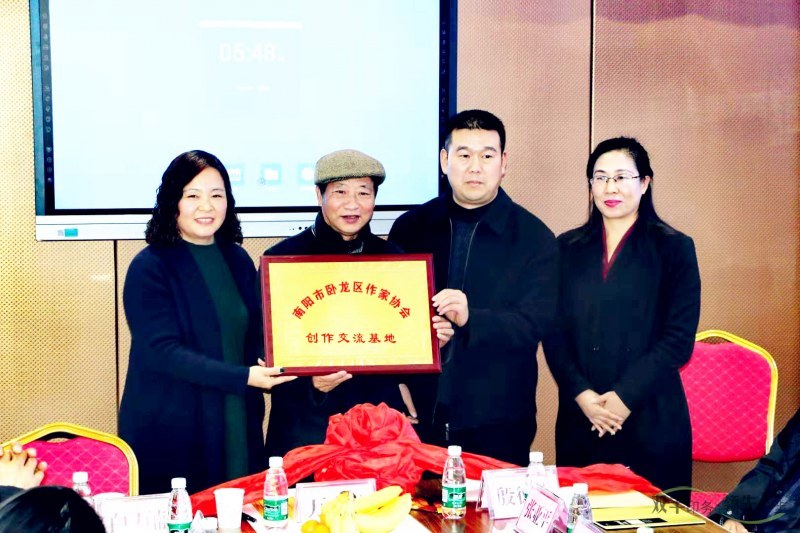 最后,萬(wàn)青菊、殷德杰、魯釗、丁艷麗共同為臥龍作協(xié)創(chuàng)造交流基地揭牌。