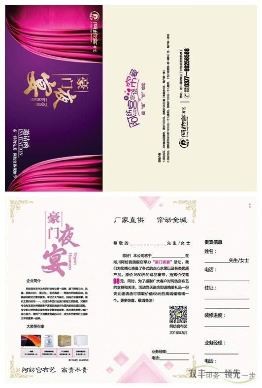 5月初,阿紡宮布藝由于舉辦招商會需要印刷一批招商會邀請函,時間比較緊迫,品質要求又高、還有特殊工藝,一般的小型印刷廠滿足不了顧客的需求,所以通過網絡搜索:“邀請函印刷廠家”找到了我們。且通過與網站客服溝通,與業(yè)務經理探討制作工藝,最終與南陽雙豐印務簽單定做。